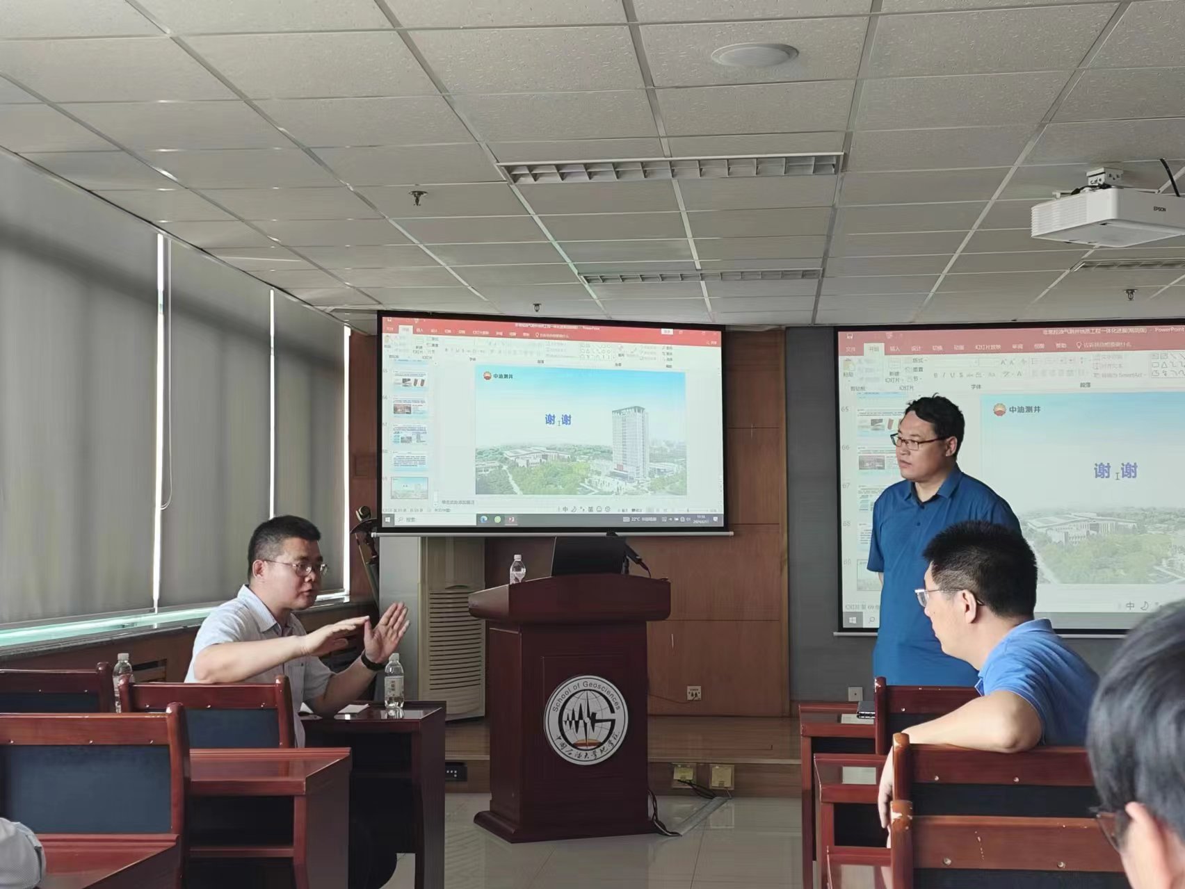 提高了优质储层的钻遇率。在岩石物理解释评价方面,室内高精度联测技术体系、井场高保真快测实验技术、多尺度多维度储层流体评价技术、可压性评价技术、建模和导向支持技术和压裂优化设计及监测技术提供了高精度高保真的成像质量。最后分享了地质工程一体化技术在川渝页岩气和长庆油田页岩油中的具体应用情况,未来将进一步深化全周期全井段动态数据认识,助力提高采收率,会后我院师生与余首席展开了热烈讨论。