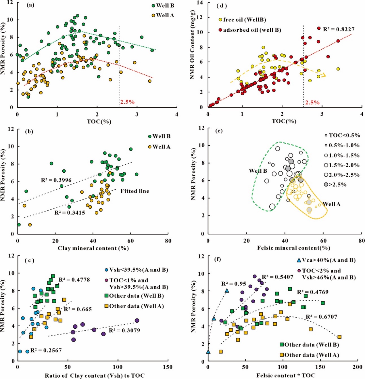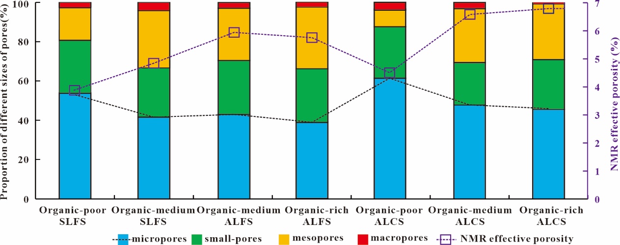 研究表明,对于中等成熟度的湖相页岩:(1)适度的总有机碳(TOC)含量(1% ~ 2.5%)是提高有效孔隙度和中孔(100 ~ 1000 nm)、小孔(30 ~ 100 nm)比例的关键因素。这与有机酸的生成和有机质裂解成孔隙有关。TOC含量过高会导致岩石的可塑性增大和沥青填充孔隙。(2)孔隙度和孔隙结构受有机质和无机矿物以及沉积构造的控制。有机质对黏土矿物相关孔隙度的改善、黏土转化的促进和黏土相关孔隙的充填具有双重作用,黏土含量与TOC比值(Vsh/TOC)可以反映有机质的影响程度,Vsh/TOC比值越大,有效孔隙度和微孔比例越大。(3)有机质和长英质矿物共同作用,提高了有效孔隙度,增大了孔隙(>30 nm),这与有机质和长英质矿物具有良好的抗压性、有机孔隙保留性和溶蚀增强孔隙效应有关。TOC与长英质矿物含量的乘积(Vsi*TOC)可以反映两者耦合作用的程度。中等TOC含量时,较高的长英质矿物含量和中等的碳酸盐含量(Vca>10%)有利于有效孔隙度的发育和较大孔隙的形成。(4) 中有机质-泥质纹层长英质页岩和中有机质-泥质纹层粘土页岩有效孔隙度较高,大孔隙比例较高,是页岩油甜点的优势岩相。