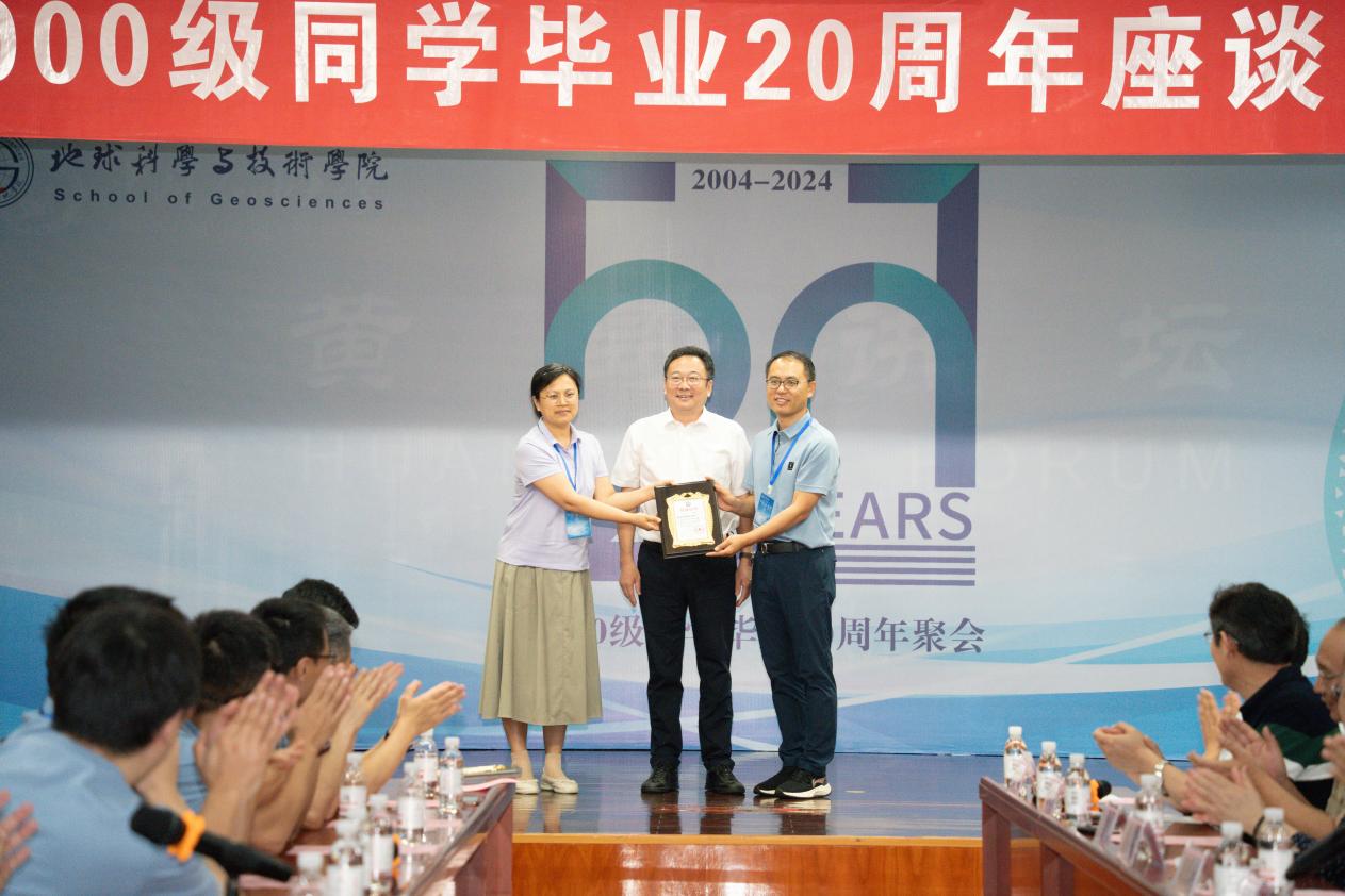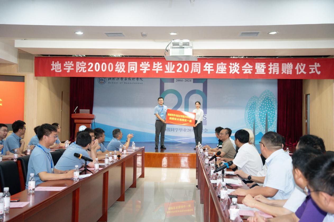 座谈会上,地学院2000级校友向学校捐赠了二十万元奖学金和一台实木地球仪。校友代表为昔日恩师献花,表达对老师在校期间谆谆教导的感激之情。