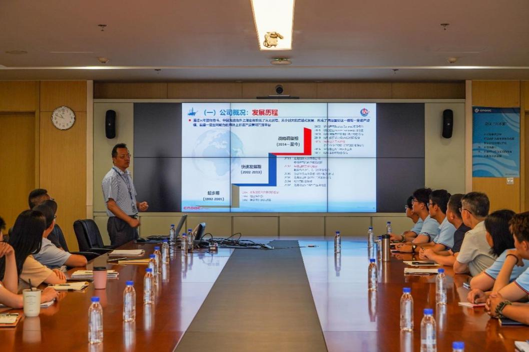 参观结束后,实践团前往中国海洋石油国际有限公司,与公司领导、部分校友进行座谈交流,海油国际海外技术支持中心主任彭文绪向实践队成员介绍了中国海洋石油国际有限公司的公司结构及科研现状,他表示“碧海丹心,能源报国”是中海油的企业文化核心,中海油公司始终以科技体制机制创新为核心动能,聚焦海上油气增储上产、数字化和新能源两个转型、科技创新攻关和成果转化过程所中存在的“堵点”、“卡点”问题,设立科研组织区、成果转化区、聚才育才区、协同创新区,建立高端智力资源使用为核心的新型科研组织模式,实施科研经费专项投入机制和科研经费“包干制”,全面支撑基础研究、关键核心技术攻关、高水平科研平台建设、高端人才引进和科研成果转化。实践团成员就石油发展现况、企业招聘需求及个人成长发展等方面展开深入交流。校友们建议,英语是每一位中海油人必须掌握的技能,希望太阳成tyc7111cc的学弟学妹们在强化专业课的学习的同时兼顾外语的学习,还要不忘家国情怀,始终秉持艰苦奋斗、能源报国的初心,尽快成长为石油勘探领域的全能型人才。