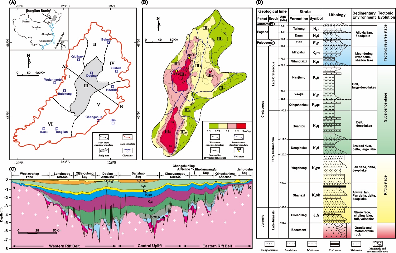 图1.松辽盆地齐家-古龙凹陷区域地质背景及研究井位