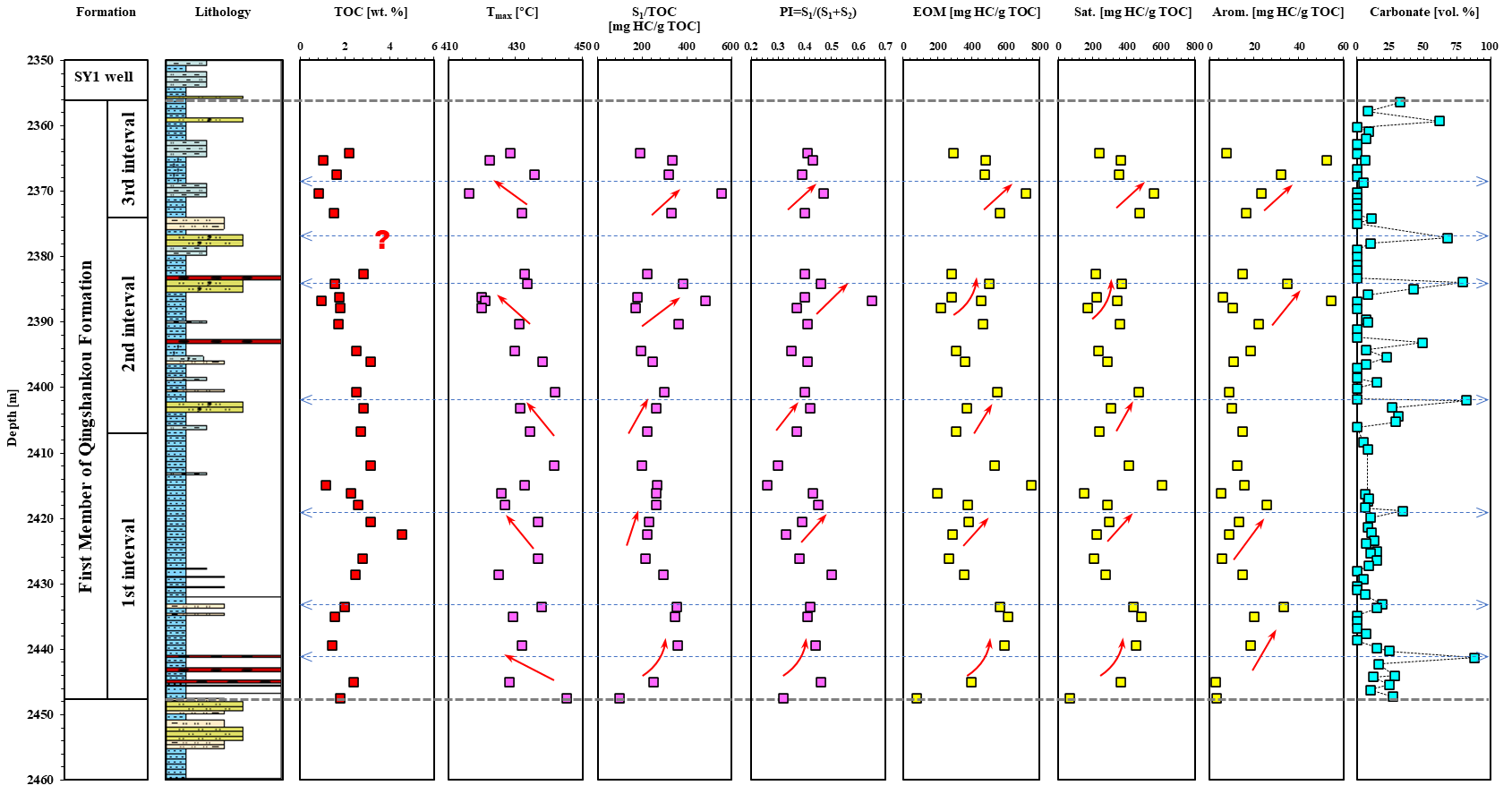 图2.松辽盆地齐家-古龙凹陷SY1井地球化学参数综合剖面图
