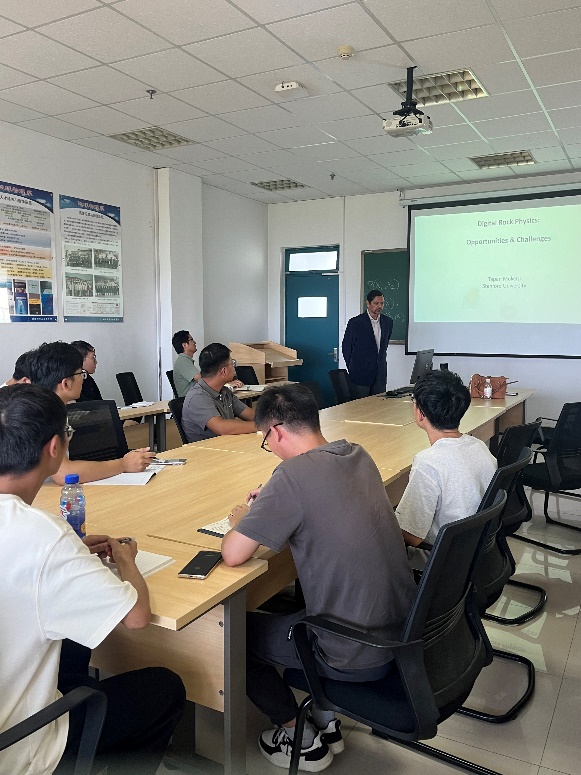 本次讲座主要探讨了数字岩石物理学的最新进展及其面临的挑战。该领域利用数字成像技术和计算方法来研究岩石的物理属性,如孔隙度、渗透率等。机会包括提高岩石分析的精确度和效率,推动储层模拟的发展。挑战则涉及数据处理的复杂性、计算成本及模型准确性等问题。Tapan Mukerji教授在报告中详细介绍了多种数字岩石物理的研究方法,例如X射线计算机断层扫描(CT扫描)、核磁共振成像(NMR)、数字图像处理(Digital Image Processing)。这些有利于我们探究岩石内部构造的同时,提供了可用于大数据分析、应用性广、灵敏度高等优势。数字岩性的发展在计算物理、实验室岩石物理中具有极佳实用性以及实际意义,帮助我们更好的理解和认识岩石结构,为油气的勘探开发、能源井的监测奠定了基础。但同时,由于过分详细的结构导致冗余数据难以通过普通计算机处理,计算量庞大、数据解读复杂、算法依赖性高等限制了数字岩石物理的发展,数字岩石物理学的机遇和挑战是相辅相成的。技术进步和跨学科应用提供了丰富的机会,但也伴随着高成本、数据处理复杂性和技术局限性等挑战。应对这些挑战需要不断的技术创新、跨学科合作以及对现有工具和方法的改进。 最后我院师生踊跃提问,与Tapan Mukerji教授进行了互动交流,本次报告取得了非常好的效果。