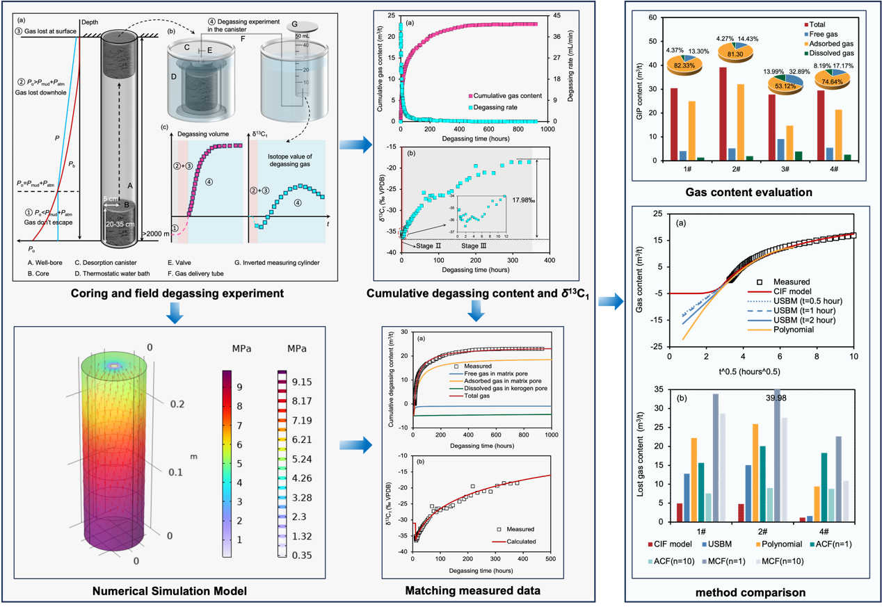 吸附态气体占主导地位的观点在浅部煤层气中被广泛接受,但在深部煤层气中受到挑战。因此,准确评价原位地层条件下深部煤岩中的总含气量和吸附气/游离气比例,由于事关深部煤岩资源量评估、甜点筛选以及后期开发方案的制定和调整,受到了业界的广泛关注和重视。近年来的研究发现,低渗岩石内气体在扩散和吸附/解吸过程中存在明显的同位素分馏现象,且该同位素分馏特征与岩石总含气量和吸附气/游离气比例密切相关,这为评价深部煤岩关键含气性参数提供了全新的思路。通过构建碳同位素分馏(CIF)模型计算页岩中原位含气量和吸附气/游离气比例的可行性和准确性已被广泛证实,但在深部煤层气中尚未得到实验和理论检验。在本次研究中,作者们对来自鄂尔多斯盆地山西组和太原组的深部煤岩样品进行了现场解析实验和甲烷碳同位素值测试。结果表明,深部煤岩在解析过程中的甲烷碳同位素分馏存在复杂的多阶段特征,指示了深部煤岩发育的多尺度孔隙结构。前期针对均质孔隙结构构建的简单CIF模型无法有效表征本文观测到的这一复杂同位素分馏现象。基于上述发现,作者们首次建立了一个考虑双分散孔隙结构和多气体传输机理(粘性流、克努森扩散和表面扩散)耦合的改进CIF模型。该模型能够很好的表征深部煤岩解析过程中复杂的同位素分馏行为。借助这一改进的CIF模型,作者们计算得到了研究区深部煤岩样品的原位含气量介于27.78 m3/t~39.13 m3/t(平均为31.68 m3/t),原位的游离气比例介于13.30%~32.89%(平均为19.45%)。这些研究结果为我国深部煤层气的资源潜力评估和开发方案制定提供了新的理论和技术支持。