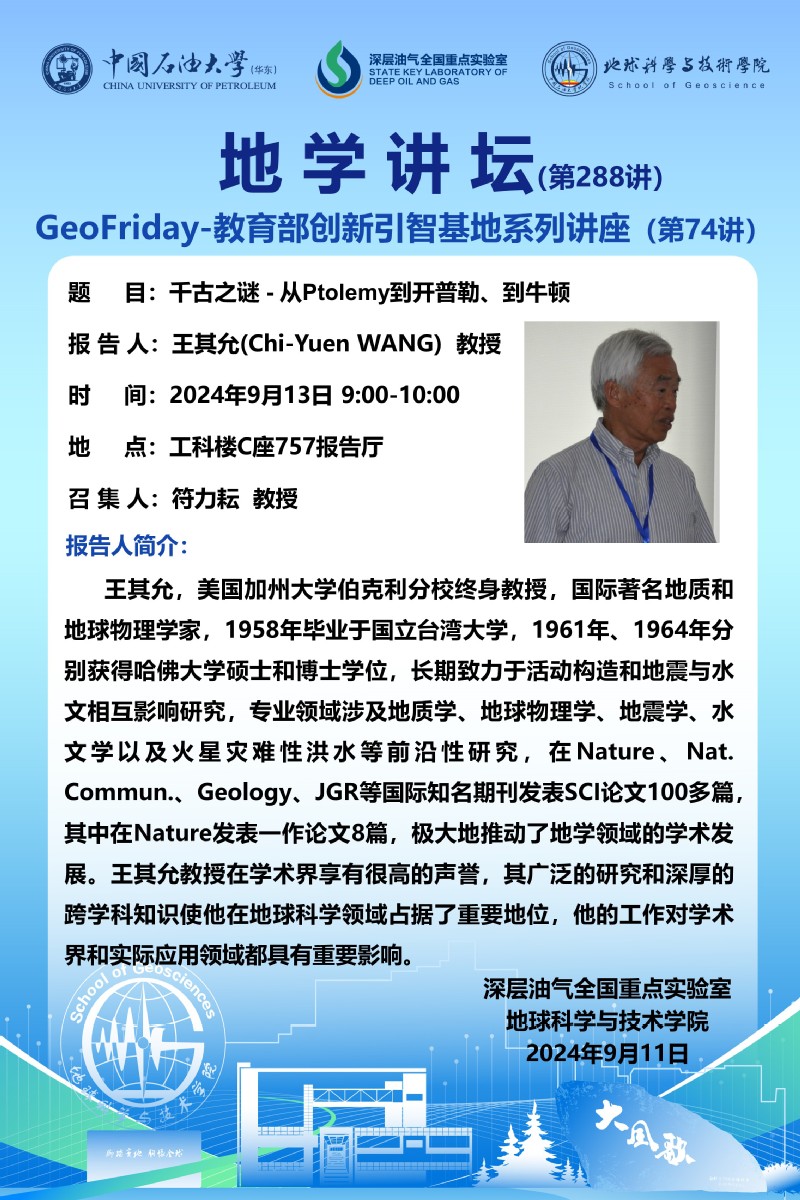 【地学讲坛第288讲】关于王其允(Chi-Yuen WANG) 教授《千古之谜 - 从Ptolemy到开普勒、到牛顿》学术报告的通知