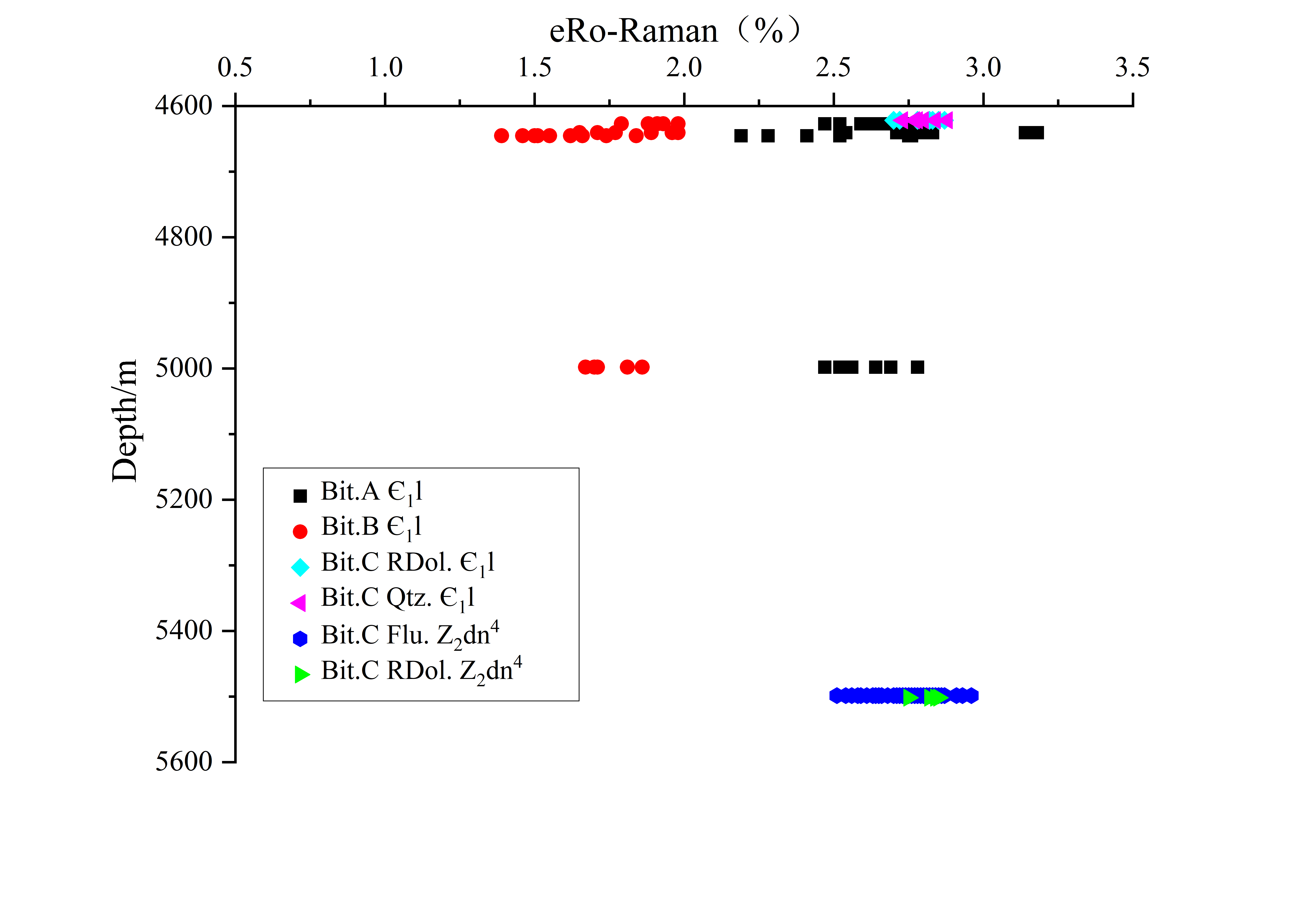 四川盆地中部地区安岳气田储层固体沥青含量丰富,分布广泛。太阳成tyc7111cc陈勇教授团队以川中磨溪地区寒武系龙王庙组(Є1l)和震旦系灯影组四段(Z2dn4)碳酸盐岩储层中孔隙和包裹体内的固体沥青为研究对象,系统开展了岩相学和固体沥青拉曼光谱、反射率及电子探针等分析工作,结果显示同源固体沥青在经历了相同的最高地温后,其成熟度存在显著差异(图1和2)。具体来说,根据岩石学观察,确定了三种类型的固体沥青(Bit. A、Bit. B和Bit. C)。Bit. A充填与早期细粒白云岩溶蚀孔隙,细小分散,eRo-Raman(通过拉曼光谱获得的等效镜质体反射率)值集中于2.60%~2.80%;Bit. B具较大的块状形态,分布在重结晶白云石或晚期自形之间的孔隙中或充填在缝合线中,eRo-Rama值在1.80%至1.90%之间;Bit. C为被各种成岩矿物捕获的沥青包裹体,eRo-Raman值在2.70%至2.87%之间(图2)。结合元素分析表明,硫元素的参与沥青热演化可能导致其成熟度的差异。该研究结果表明,在利用储层孔隙中(开放体系)固体沥青成熟度确定热演化史时应谨慎,而被捕获在包裹体(封闭系统)中的固体沥青作为成熟度指标更为可靠。