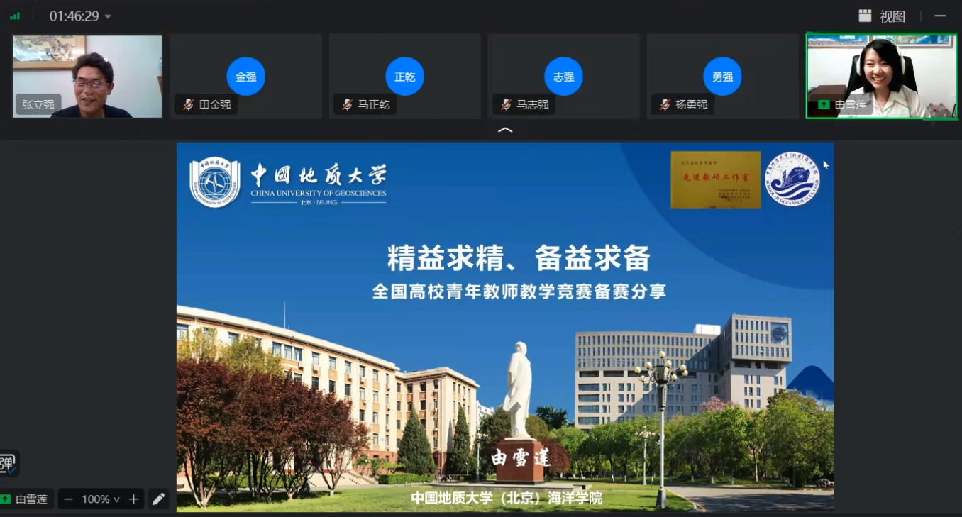 2024年9月16日晚上,教育部“油气田开发地质课程”虚拟教研室、山东省示范性基层教学组织、地学院举办地学讲坛(第289讲)—教育部虚拟教研室教学创新与教学比赛专题系列讲座,邀请了中国地质大学(北京)海洋学院博导、副院长—由雪莲副教授,作题为《精益求精,备益求备—全国高校青年教师教学比赛备赛分享》的专题报告,虚拟教研室教师成员以及来自中国地质大学(武汉)、东北石油大学、山东科技大学、吉林大学、西北大学和贵州大学等全国近二十所高校90余人参加了线上会议,教育部虚拟教研室建设点、山东省示范性基层教学组织负责人、资源系主任张立强教授主持会议。