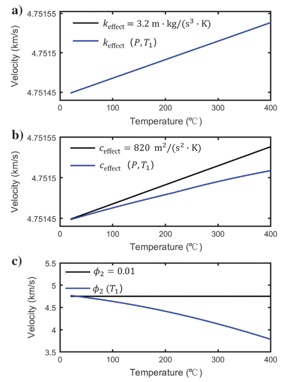 图2.不同热-水-力学(THM)特性引起的温度依赖P波速度的比较:(a)热导率;(b)比热;(c)裂缝孔隙率。