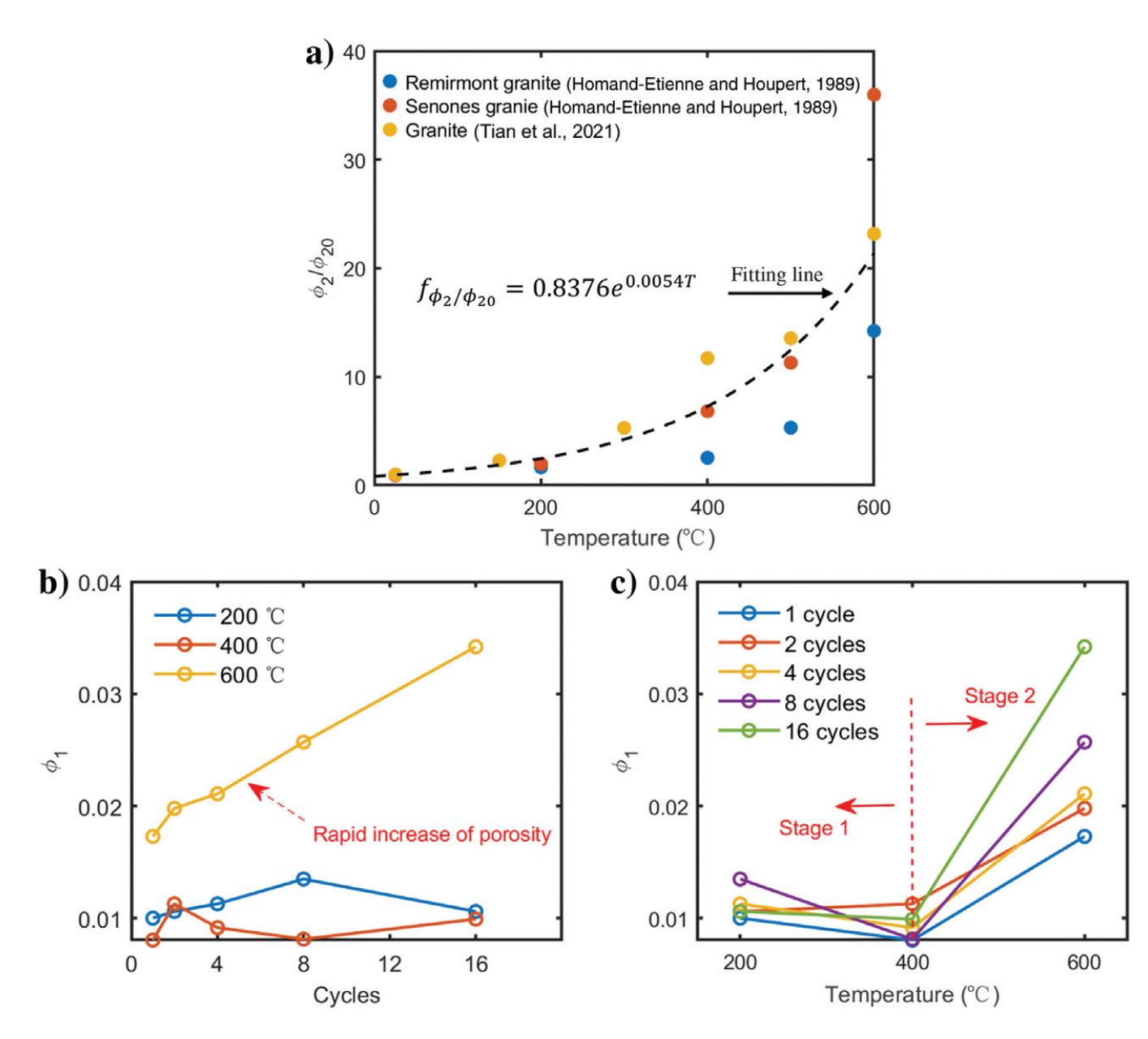 图1.花岗岩的热效应:(a)温度依赖的裂缝孔隙率;(b)热循环过程中的基质孔隙率;(c)温度依赖的基质孔隙率。