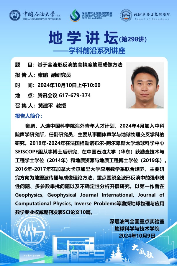 【地学讲坛第298讲】关于雍鹏 副研究员《基于全波形反演的高精度地震成像方法》学术报告的通知