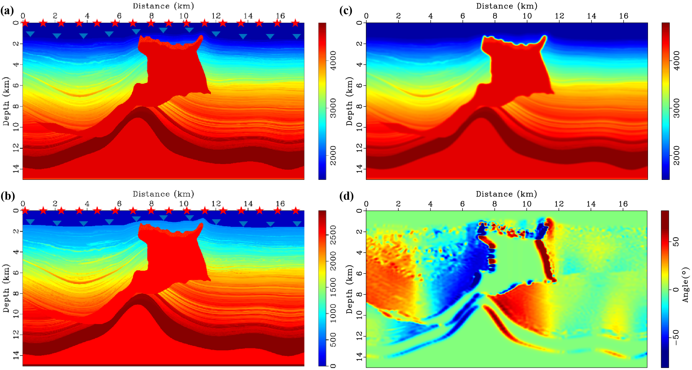 图1.SEAM模型ERTM实验。(a) P波速度模型;(b) S波速度模型;(c) P波偏移速度模型;(d)倾角信息。