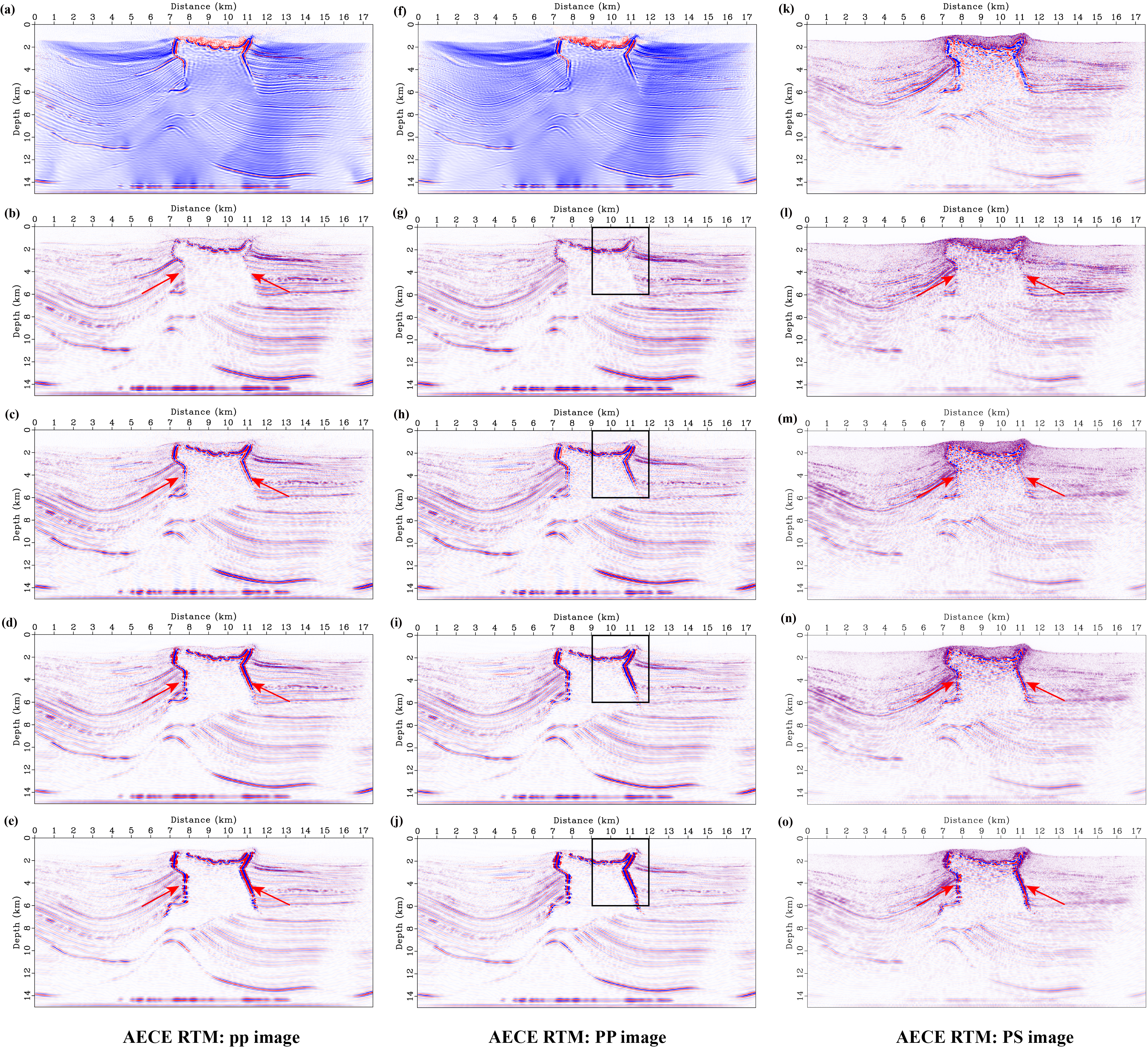 地下高陡构造,如潜山、断裂带和盐翼,由于大入射角的弱照明,在地震勘探中难以精确成像。为了解决这一问题,我们提出了一种声学和弹性逆时偏移(ERTM)的角度相关成像条件,以改善高陡构造的成像质量。我们首先使用基于希尔伯特变换的波场分离方法,将外推波场分解为上下左右行波。我们观察到,左右行波可以准确成像高陡构造,而上下行波主要贡献于倾角较小的层。然后,我们开发了一种角度相关成像条件,利用分解后的方向波场来增强平坦层和高陡构造的质量。在ERTM中,经过定向波场分解后,采用矢量Helmholtz分解对PS波场进行解耦。