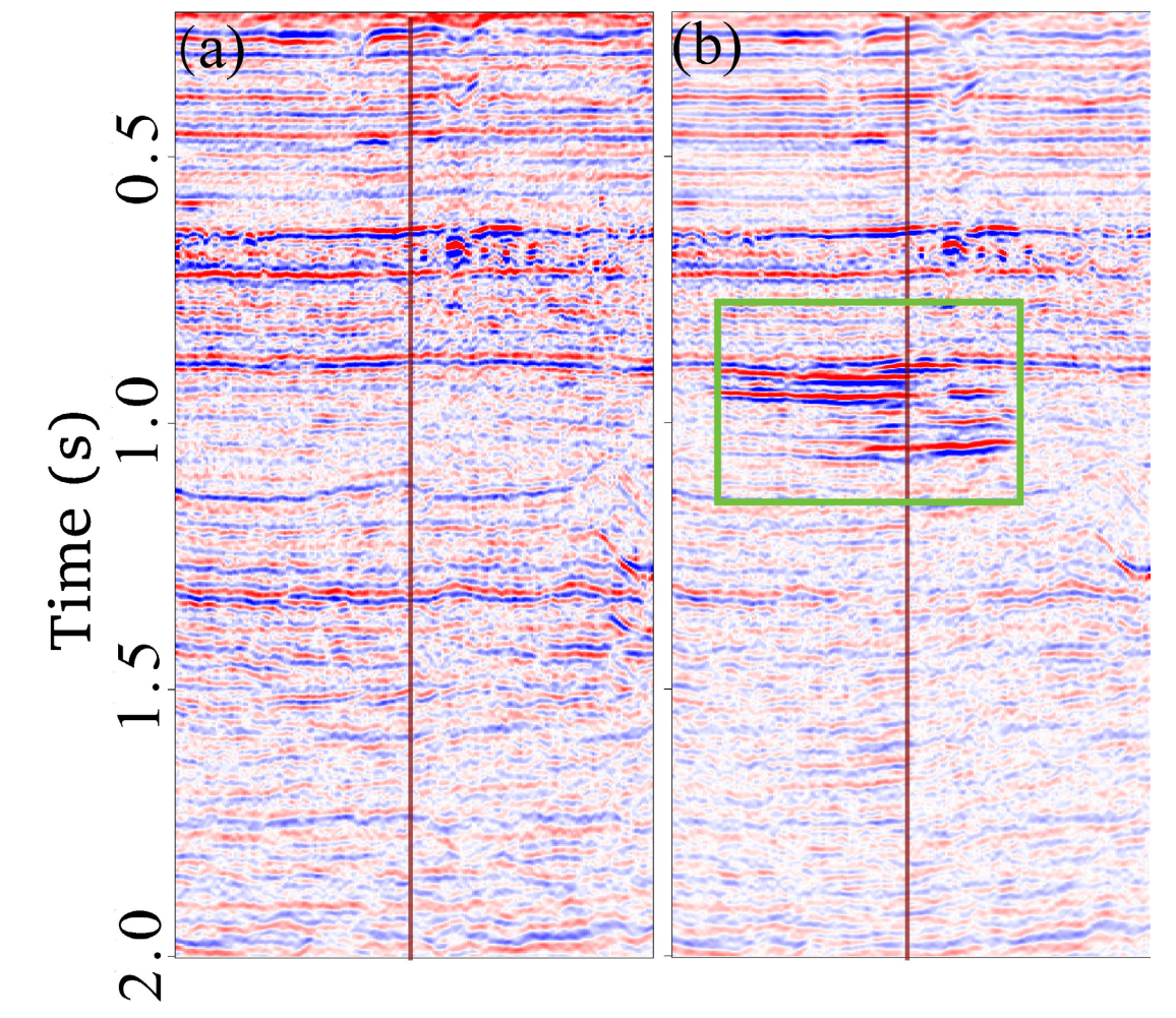图1. 挪威北海sleipner数据,a为CO2注入前的地震数据,b为CO2注入后的地震数据,绿色框内为二氧化碳注入所致。