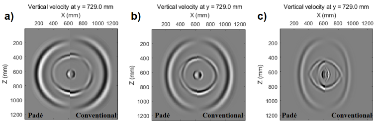 图2.不同预应力下孔声弹性和Padé孔声弹性模拟:(a)围压,(b)单轴,(c)纯剪切