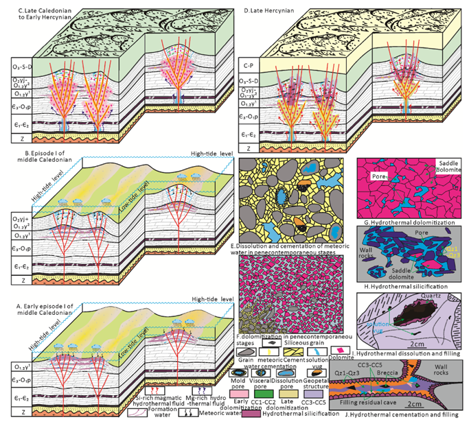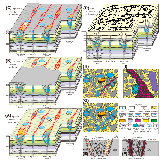 在成岩流体演化恢复的基础上,通过流体-岩石作用分析,系统探讨了沉积水、大气水、有机酸、富镁热液和富硅岩浆热液对断控碳酸盐岩储层的改造作用,明确了大气水与富镁热液的建设性作用机理和富硅岩浆热液的破坏性机理,综合断裂结构分析,明确了顺北-跃进和顺南地区断控碳酸盐岩储层形成机制与发育模式(图3和图4)。