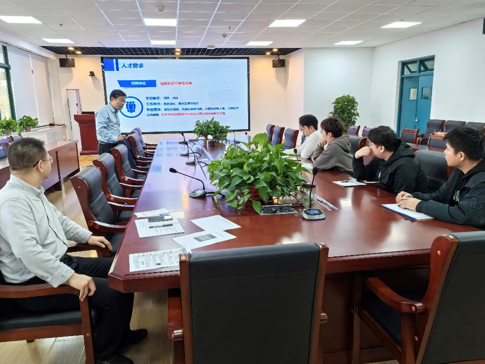 招聘专员首先从行业发展角度介绍了单位发展历程及目标、组织架构以及技术服务项目等多维度介绍了单位的基本概况。随后,他从单位人才培养体系、职业发展平台支撑,结合福利薪资、单位地域特点等从职工个人发展及生活角度展开介绍。他表示,单位实行“多劳多得、多能多得”激励政策,鼓励毕业班学生积极入职、充分发挥个人才能。