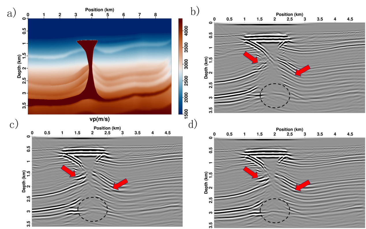 图2.(a)2007 BP TTI模型速度模型(b)各向同性逆时偏移成像结果(c)VTI逆时偏移成像结果(d)本文方法成像结果