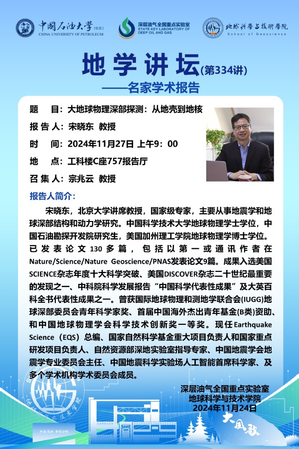 【地学讲坛第334讲】关于 宋晓东 教授《大地球物理深部探测:从地壳到地核》学术报告的通知