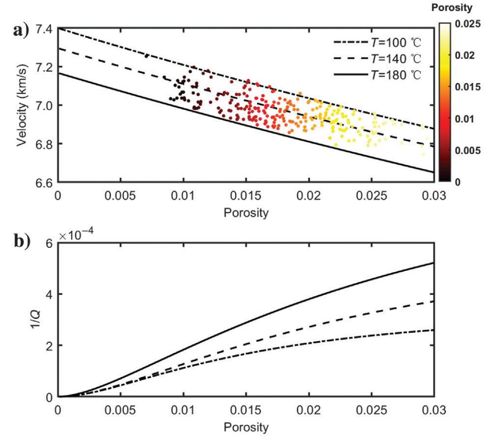 此外,我们研究了热物理特性(如热导率和松弛时间)对不同模式波速和衰减的影响。研究结果证实,在高频情况下,T波更容易出现在具有高热导率和高均匀性的介质中。所提出的模型可以分析实际岩石中P波的非弹性行为,包括在高温高压下不同频率的热效应。通过将理论结果与测井数据进行比较,验证了模型的准确性。图2a比较了不同温度下预测的P波速度与测井P波速度随孔隙度变化的关系,图2b展示了不同温度下的衰减因子随孔隙度变化的情况,频率为声波频率。如预期的那样,P波速度随着孔隙度或温度的增加而降低。温度对P波速度的分布具有良好的约束作用。