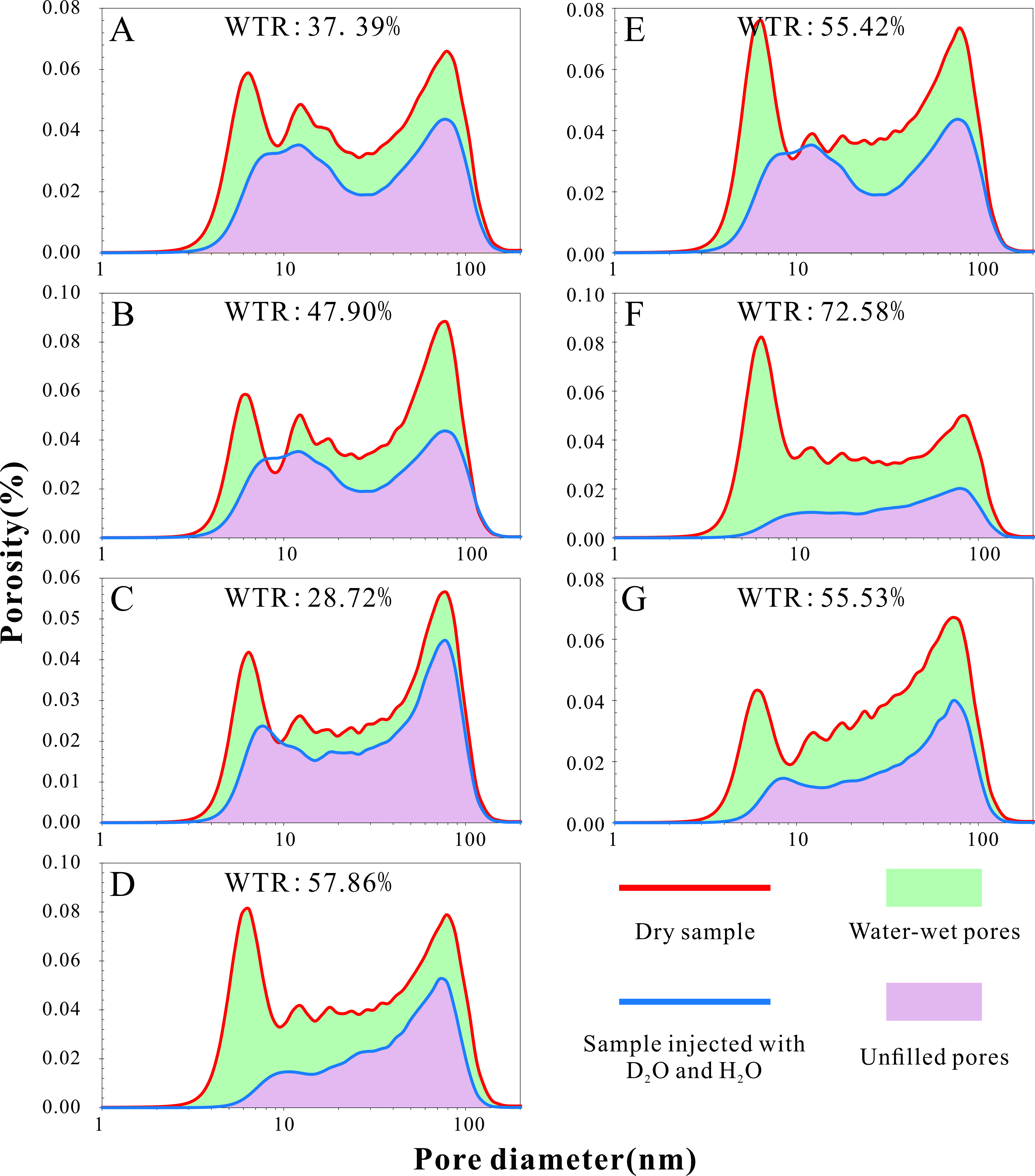 衬度对比-小角中子散射显示,在自发渗吸的条件下,1-200nm亲水孔占据了总孔隙的28.7-72.6%。核磁共振结果显示,在自发渗吸和水蒸气吸附两种情况下,随着时间的推移,水首先填充小孔,再填充大孔。在高湿度情况下,水蒸气吸附虽然比自发渗吸吸水速度慢,但仍然有大量的水被吸入。