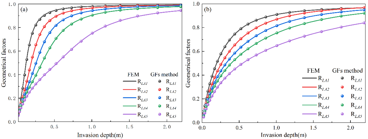 阵列侧向测井响应逼近计算方法和数值几何因子包含三个优点:(1)数值几何因子理论弥补了现有直流电测井几何因子的理论空白,且能够直观给出纵向和径向地层的空间贡献分布;(2)几何因子曲线可用于快速计算测井响应。与传统的物理驱动建模相比,计算速度可以提高数千倍,从而实现实时数据处理。同时,几何因子的正演建模可以处理任意层的地层,从而解决了传统数据驱动方法只能固定地层数量建模问题;(3)几何因子用于近似测井响应相对于地层电阻率的导数,显著降低确定性反演的雅可比矩阵计算的复杂性。数值几何因子不仅可以作为阵列侧向测井较好的正演方法,还将有助于加速层状结构中测井的建模和反演。