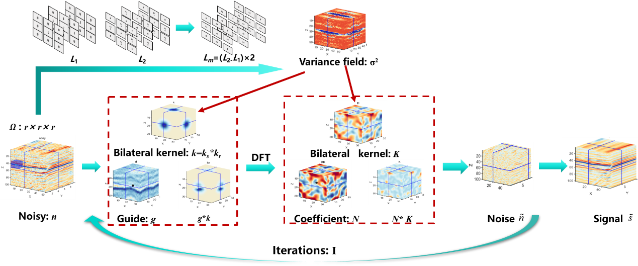 逐级图像降噪方法最初是针对图像数据,其中噪音方差多为已知。这种已知方差的情况允许对信号和噪音进行精确的估计和分离。然而,地震数据与图像数据有很大的不同,地震信号往往由于地震波的传播过程而表现出强烈的能量变化,并且通常是受盲噪声影响的三维数据。全局噪声方差不足以准确估计不同深度地震信号中的噪声。此外,传统的二维逐级图像降噪方法可能忽略了地震数据的空间特征。