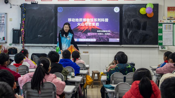 志愿者向学生科普地学知识 陆艳微摄