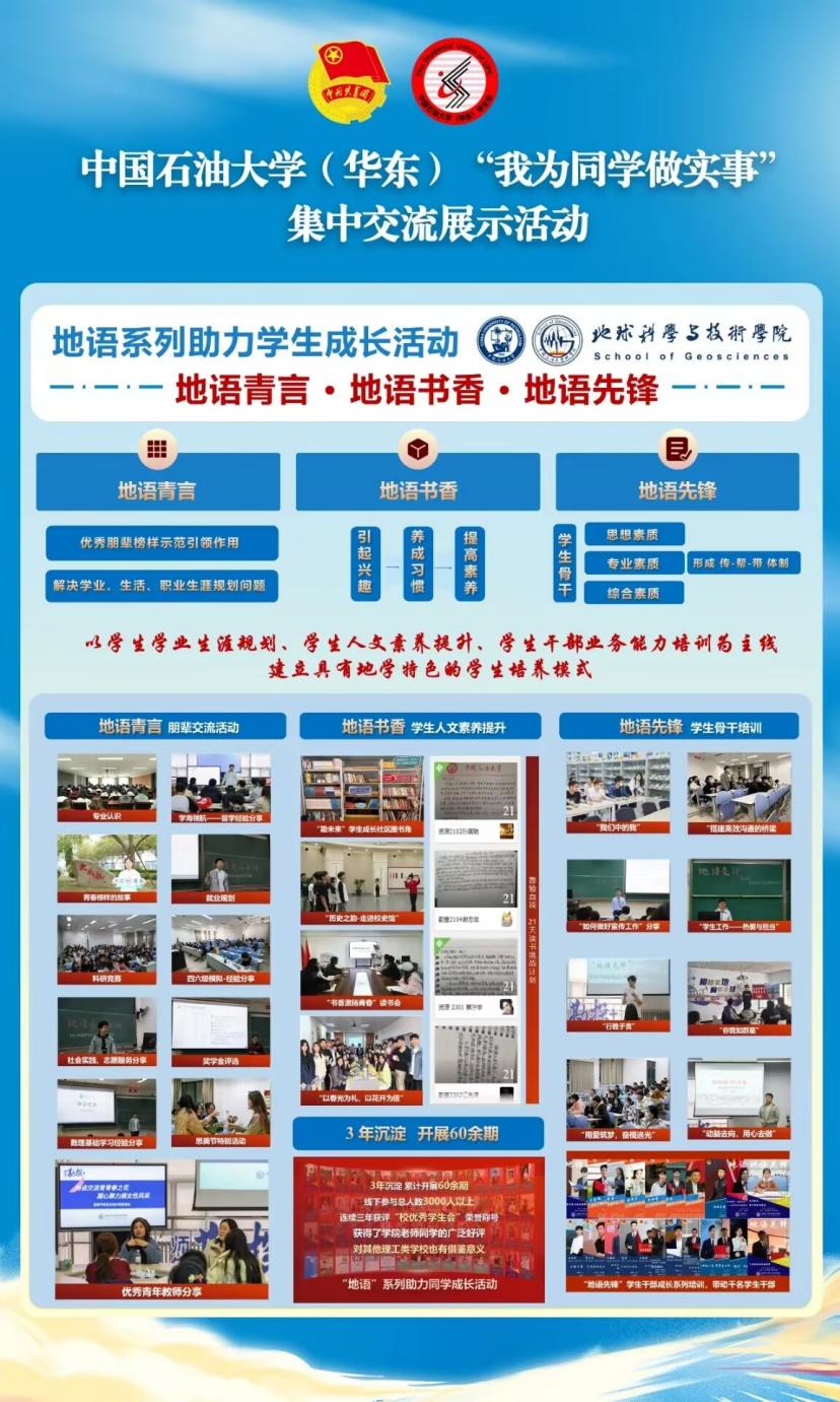 青春铸魂——完善学科特色思政育人体系,坚持思想引领走在前。升级经纬论坛、地语青言、青马工程等育人载体,邀请英模人物、专家校友与学生面对面交流12场。强化勘探精神教育,连续3年开展“团旗在山谷飘扬”地质实习思政教育活动,获《中国青年报》报道;“能源报国行”油田实践团调研30余家油田单位,相关视频获《中国青年报》客户端首屏推荐;广泛开展师生交流活动,采访整理老先生事迹获评教育部“读懂中国”优秀征文。