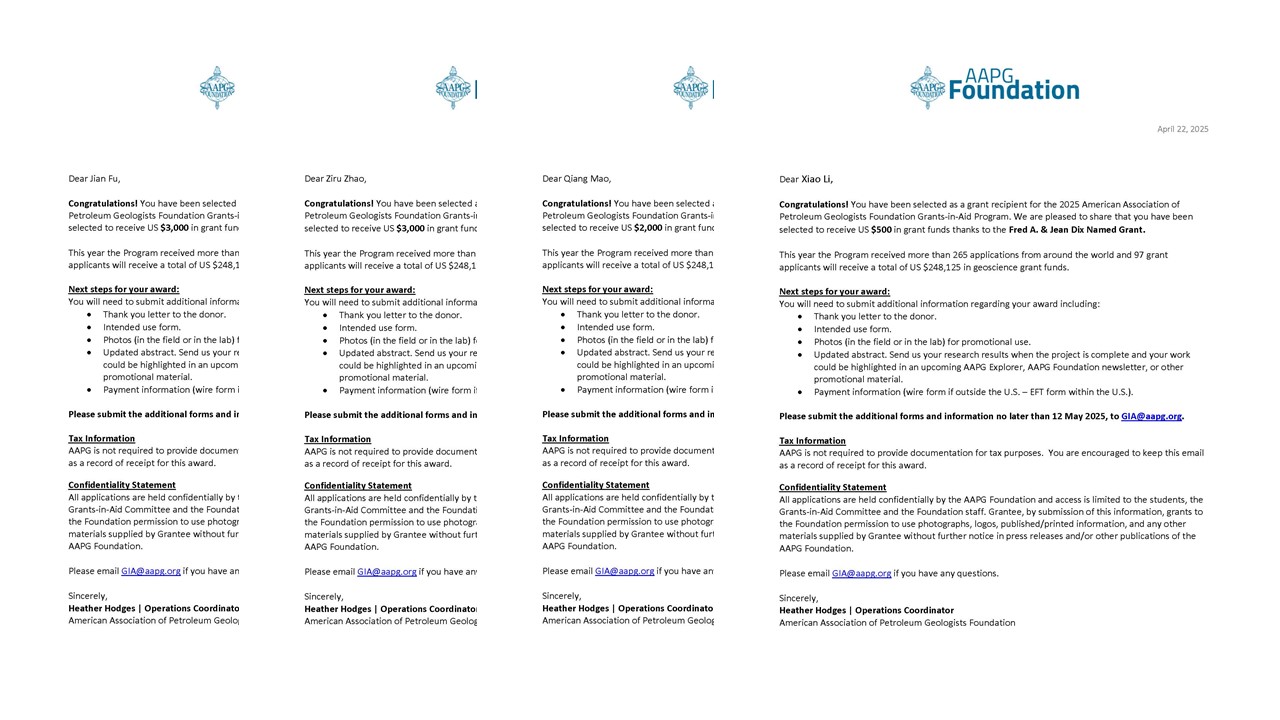 AAPG全球助研金是由美国石油地质家协会面向全球石油、能源-矿产资源的勘探与开发及相关环境地质问题领域有应用价值研究的在读硕士、博士研究生设立的基金资助项目,旨在促进地球科学的研究。该项基金资助申请在每年10月份左右开放,次年1月份截止,4-5月份公布申请结果。2025年全球超过265名学生申请,其中97人获得资助,2025年资助金总计24.8万美元。