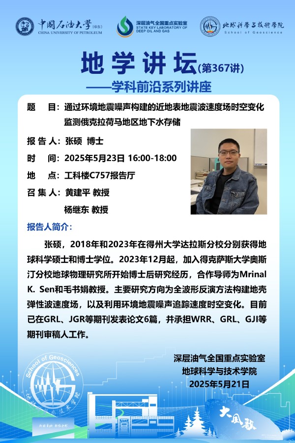【地学讲坛第367讲】关于 张硕 博士《通过环境地震噪声构建的近地表地震波速度场时空变化监测俄克拉荷马地区地下水存储》学术报告的通知