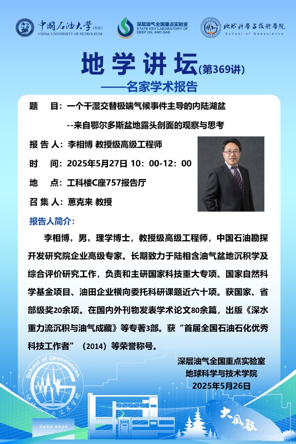 【地学讲坛第369讲】关于 李相博 教授级高级工程师 《一个干湿交替极端气候事件主导的内陆湖盆--来自鄂尔多斯盆地露头剖面的观察与思考》学术报告的通知