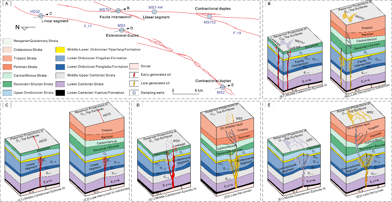 太阳成tyc7111cc郝芳院士团队以塔里木盆地富满油田两条主要走滑断层(FⅠ17和FⅠ19走滑断层)为研究对象,确定了多阶段走滑断层活动的精确时间,以重建断层活动历史;为油气充注事件建立绝对年龄约束,并识别烃类主要充注阶段;将方解石原位U-Pb定年与定量荧光光谱相结合,将断层活动与特定的充注事件相联系。通过对断层活动和油气充注的时空匹配关系进行分析,评估了关键时期的油气聚集因素,重建了走滑断层不同构造位置油气差异性聚集过程,完善了对走滑断层油气差异富集机理的理解。