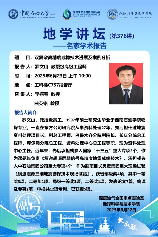 【地学讲坛第376讲】关于 罗文山 教授级高级工程师 《双复杂高精度成像技术进展及案例分析》学术报告的通知