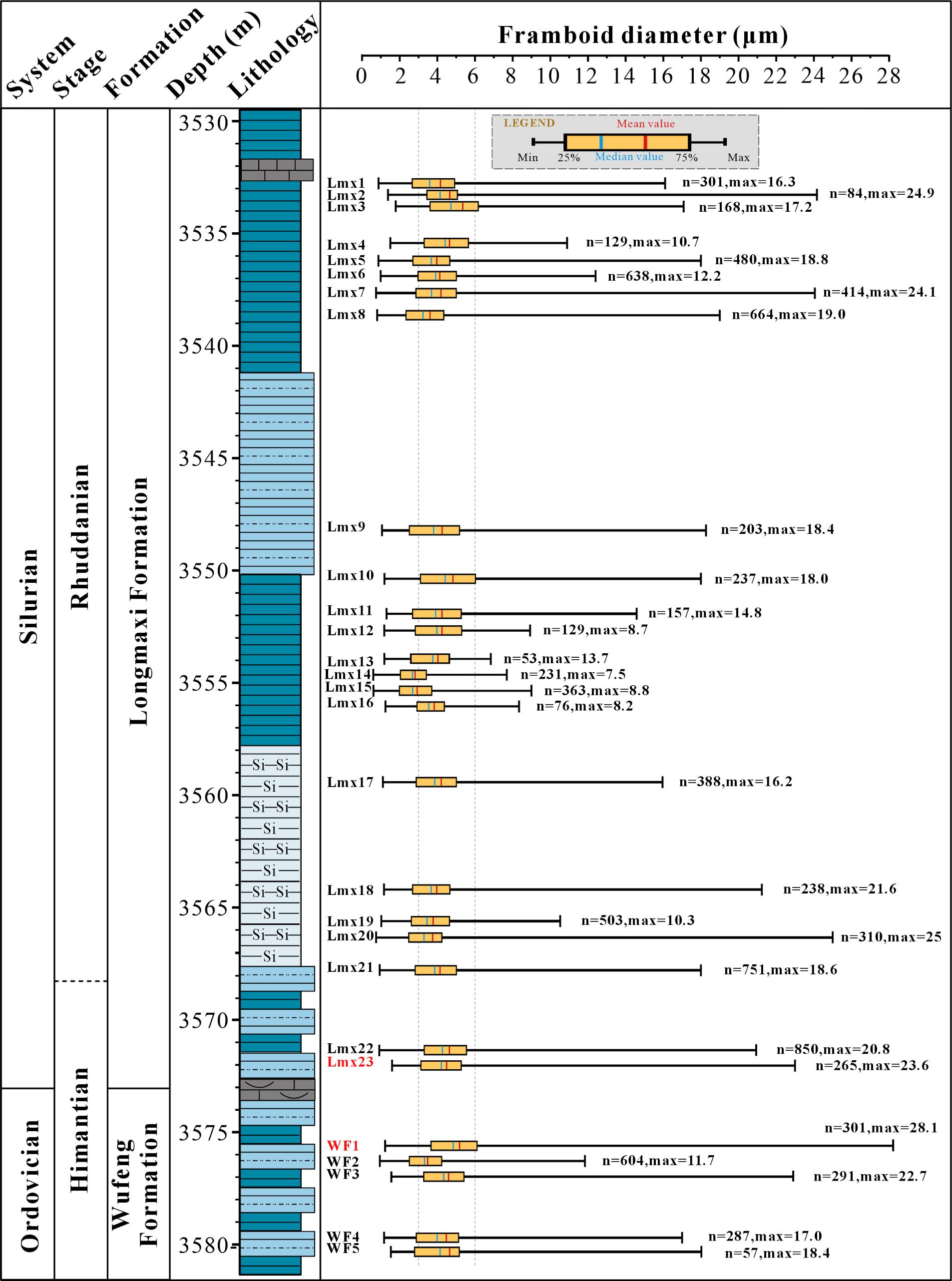 图1 华南威远地区五峰-龙马溪组页岩中草莓状黄铁矿粒度分布箱线图