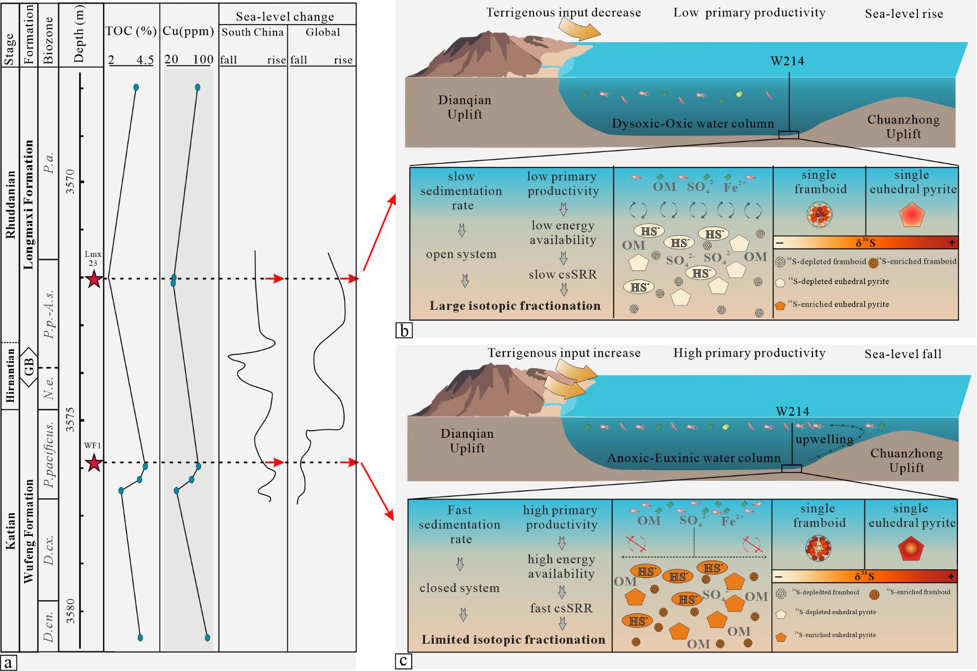 黄铁矿是一种重要的金属硫化物矿物,常见于页岩中,可在沉积和成岩过程中形成。在沉积或早期成岩阶段形成的黄铁矿的形态和硫同位素特征与其沉积环境密切相关。随着埋藏过程的进一步推进,地温梯度或小规模热液活动驱动的热化学硫酸盐还原会改变黄铁矿的形态和同位素特征。此外,地质事件和局部环境变化也会间接影响黄铁矿的形态和硫同位素特征,由于多种重叠过程可能会影响黄铁矿的形成和同位素特征,导致利用沉积黄铁矿重建沉积和早期成岩环境变得更为复杂。