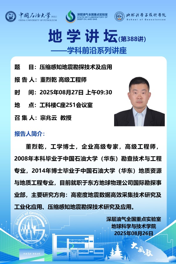 【地学讲坛第388讲】关于董烈乾 高级工程师《压缩感知地震勘探技术及应用》学术报告的通知