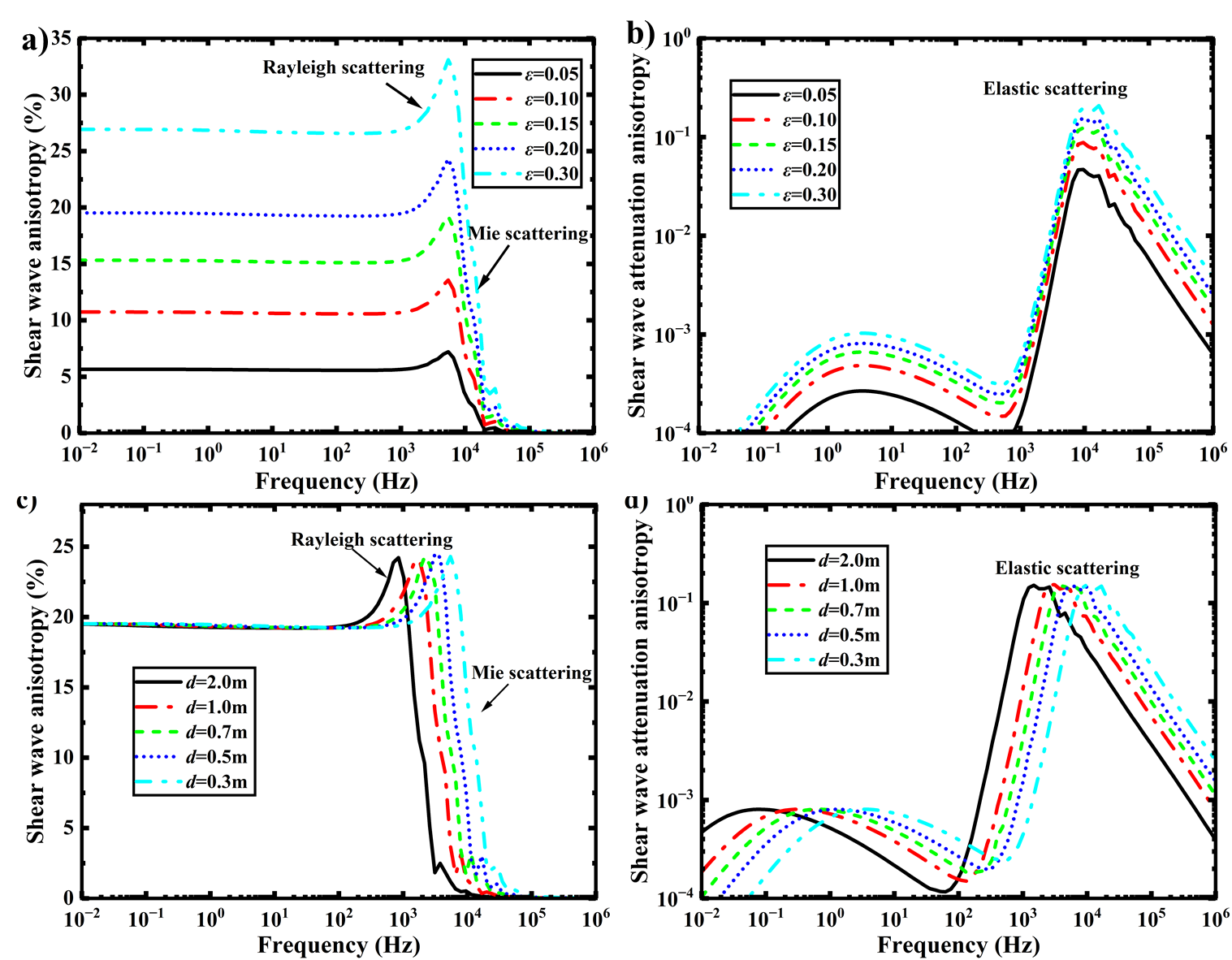 图2.两个重要参数:裂缝密度与裂缝直径对横波各向异性(a与b)及衰减各向异性(c与d)的影响