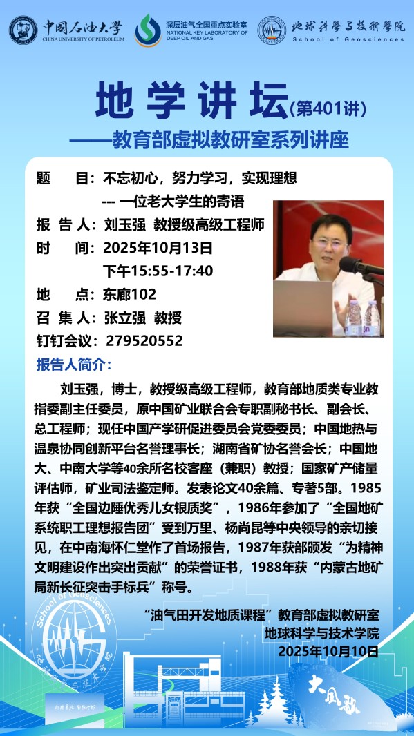 【地学讲坛第401讲】教育部虚拟教研室活动-关于刘玉强教授级高工《不忘初心,努力学习,实现理想 --- 一位老大学生的寄语》讲座的通知
