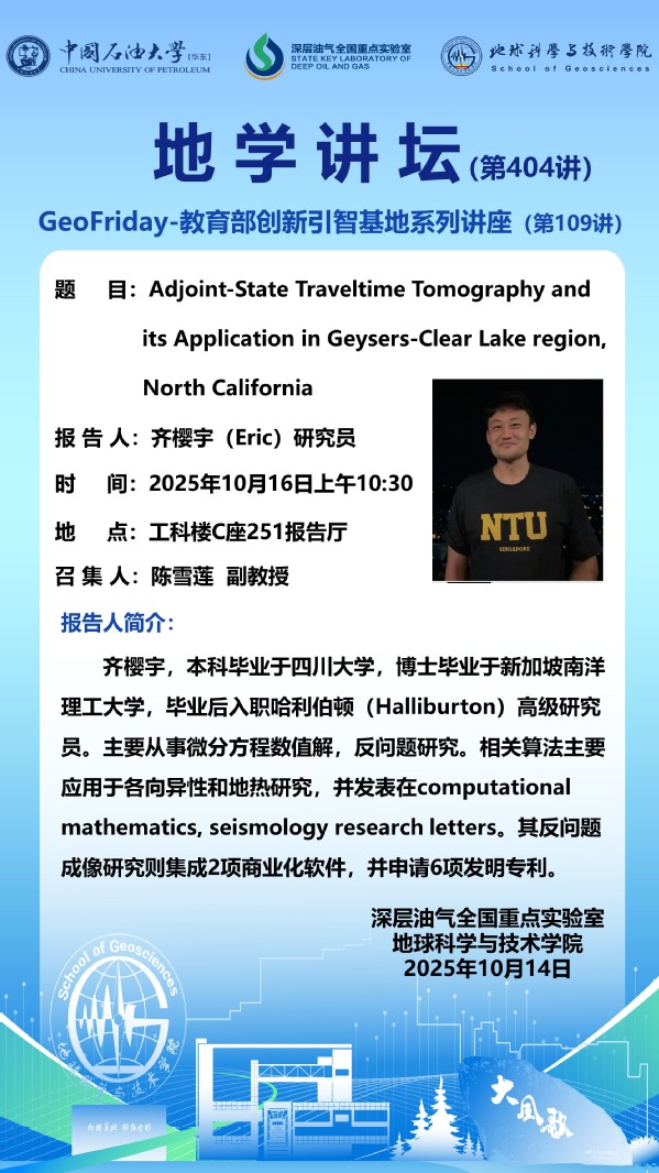 【地学讲坛第404讲】关于齐樱宇(Eric)研究员《Adjoint-State Traveltime Tomography and its Application in Geysers-Clear Lake region, North California》学术讲座的通知