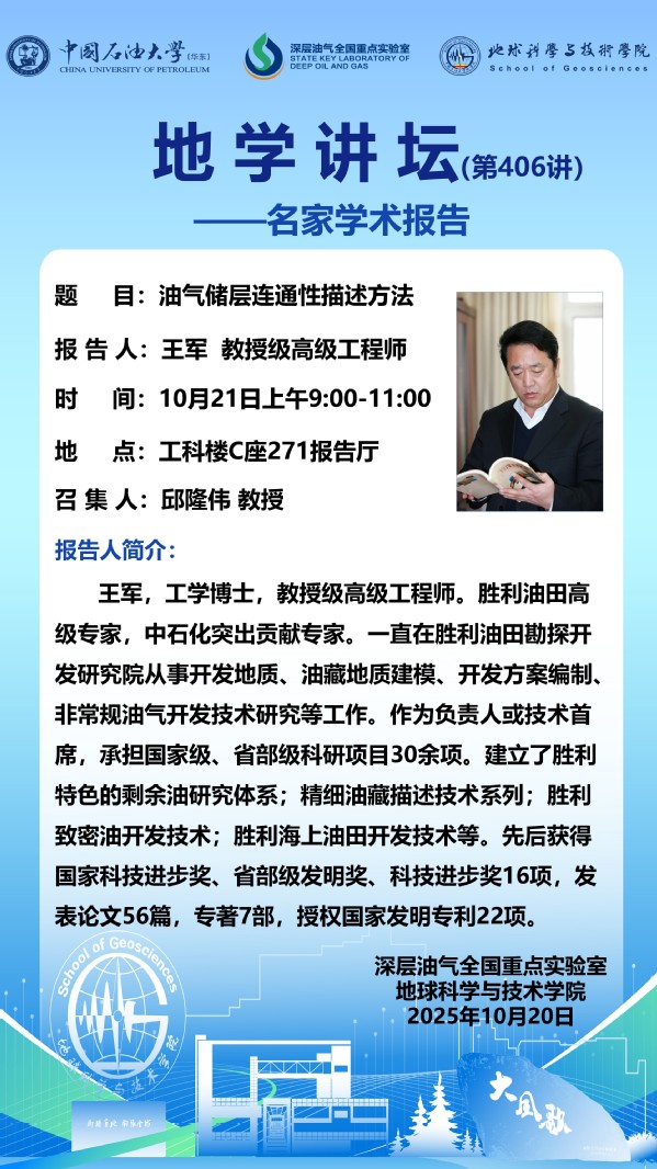 【地学讲坛第406讲】关于王军 教授级高级工程师《油气储层连通性描述方法》学术报告的通知