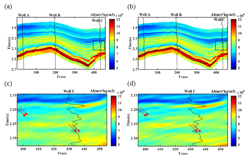 图1.(a)传统方法的阻抗反演结果;(b)提出方法的阻抗反演结果;(c)对(a)中局部区域进行放大展示的阻抗反演结果;(d)对(b)中局部区域进行放大展示的阻抗反演结果