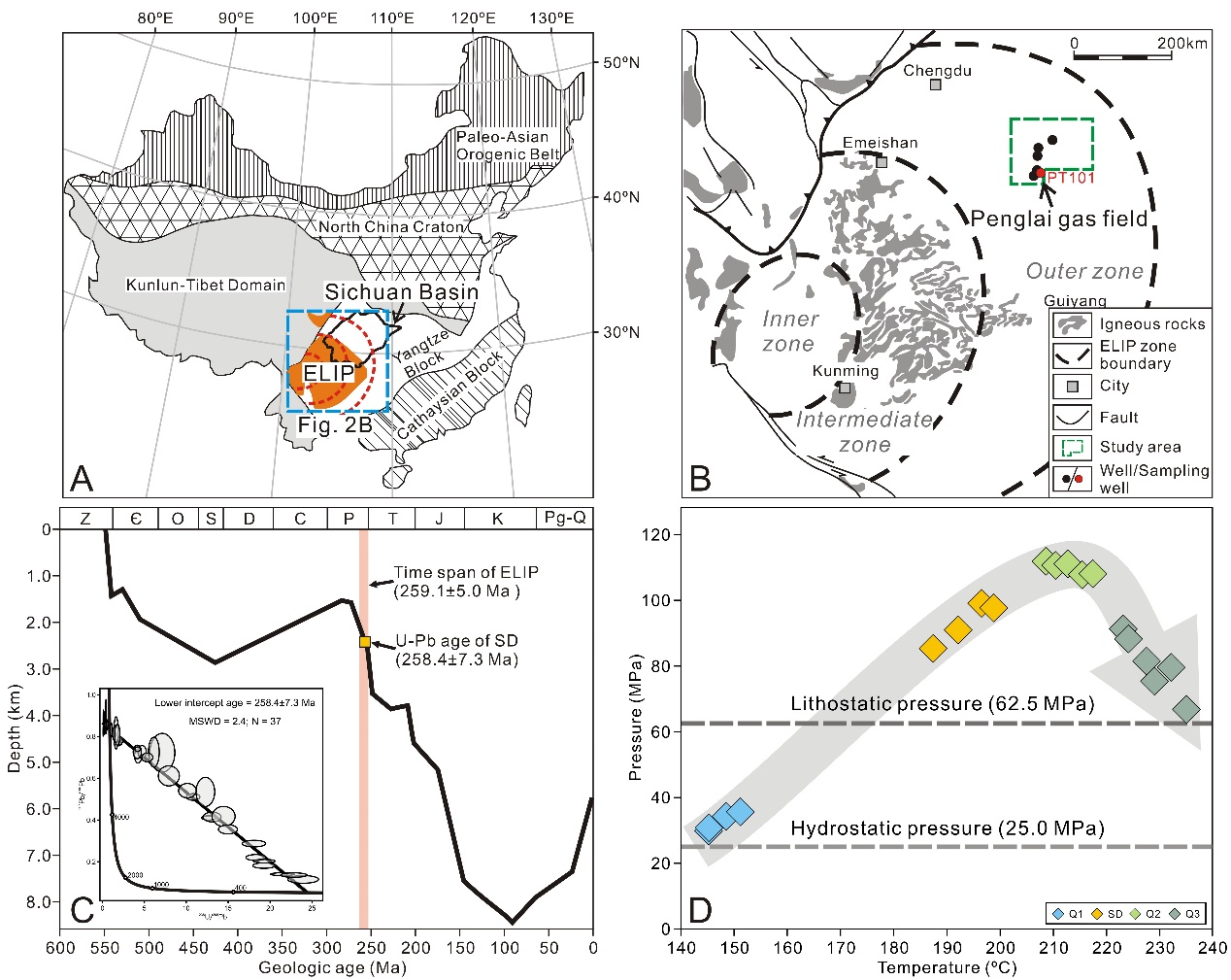 针对上述科学问题,太阳成tyc7111cc刘可禹教授团队联合北京大学金之钧院士和中石油勘探开发研究院CNPC盆地构造与油气成藏重点实验室等单位,选取位于峨眉山大火成岩省(ELIP)外带的川中蓬莱地区埃迪卡拉纪碳酸盐岩储层作为研究对象,通过对石英和马鞍状白云石等热液矿物开展详细的岩相学、流体包裹体和微区地球化学分析,证实川中地区埃迪卡拉纪碳酸盐岩储层中古油藏的快速热解发生在距今约258.4±7.3Ma(百万年),与ELIP的爆发密切相关(图1)。热液矿物中的烃类包裹体记录了古油藏的热解过程,储层压力经历先增加后快速下降的过程,指示古油藏中形成的热成因甲烷沿断层或岩浆管道快速排放到大气中,进而对瓜德鲁普世末期大灭绝产生影响。