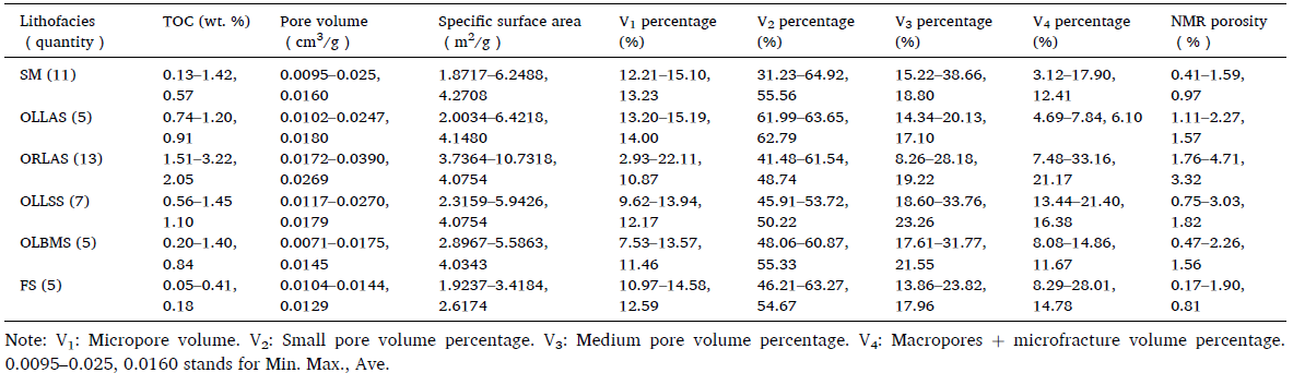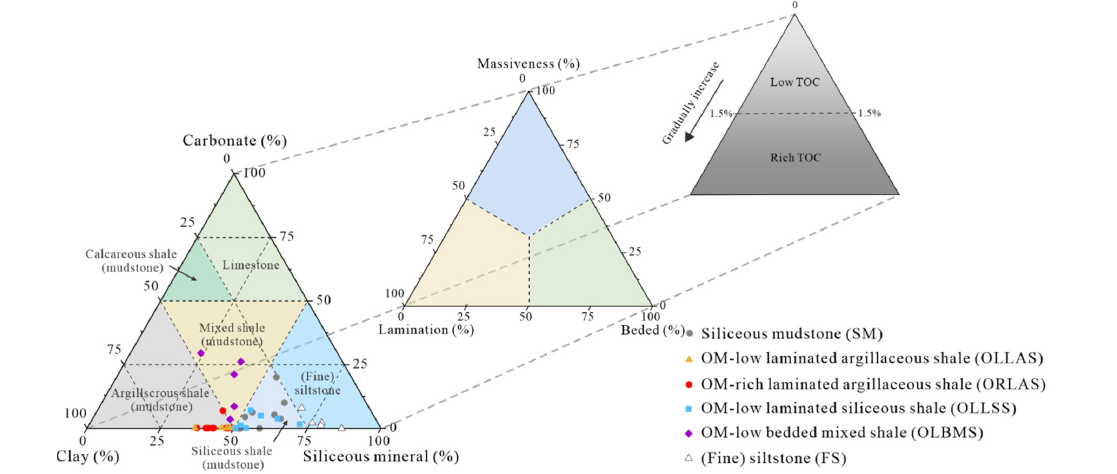 注: ORLAS(富有机质纹层状黏土质页岩)、SM(粉砂质泥岩)、OLLSS(含有机质纹层状长英质页岩)、OLLAS(含有机质纹层状黏土质页岩)、OLBMS(含有机质层状混合质页岩)和FS ((细)粉砂岩)