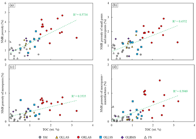 图4 TOC与孔隙度(a)、TOC与小孔及微孔核磁共振孔隙度(b)、TOC与中孔核磁共振孔隙度(c)、TOC与大孔+微裂隙核磁共振孔隙度(d)之间的关系