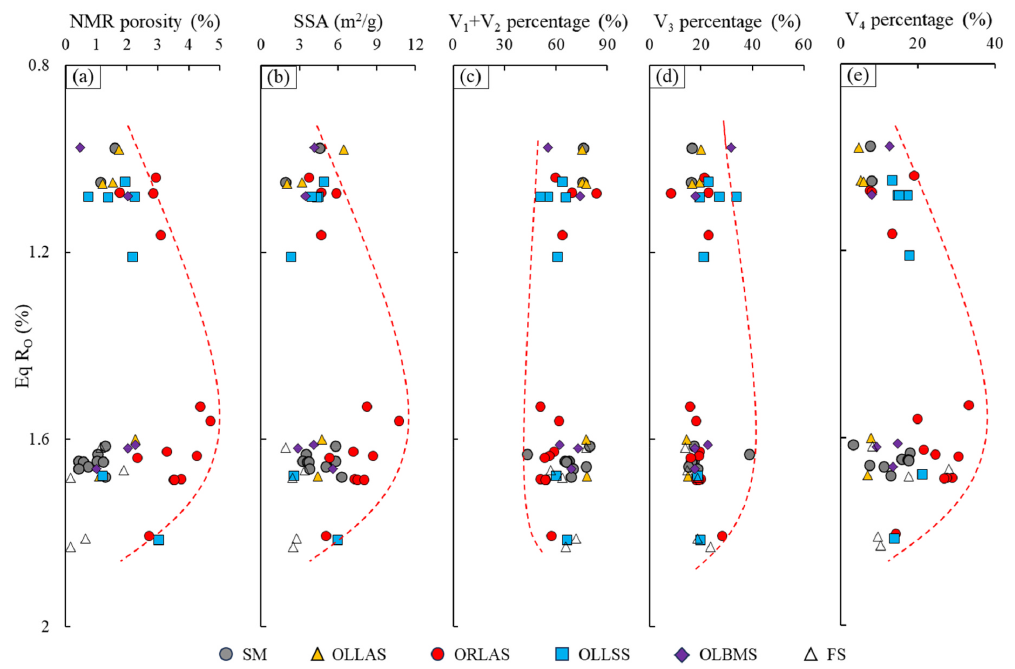 图2 不同岩相的孔隙度(a)、比表面积(b)、微孔与小孔占比(c)、中孔占比(d)、大孔+微裂隙(e)的演化特征