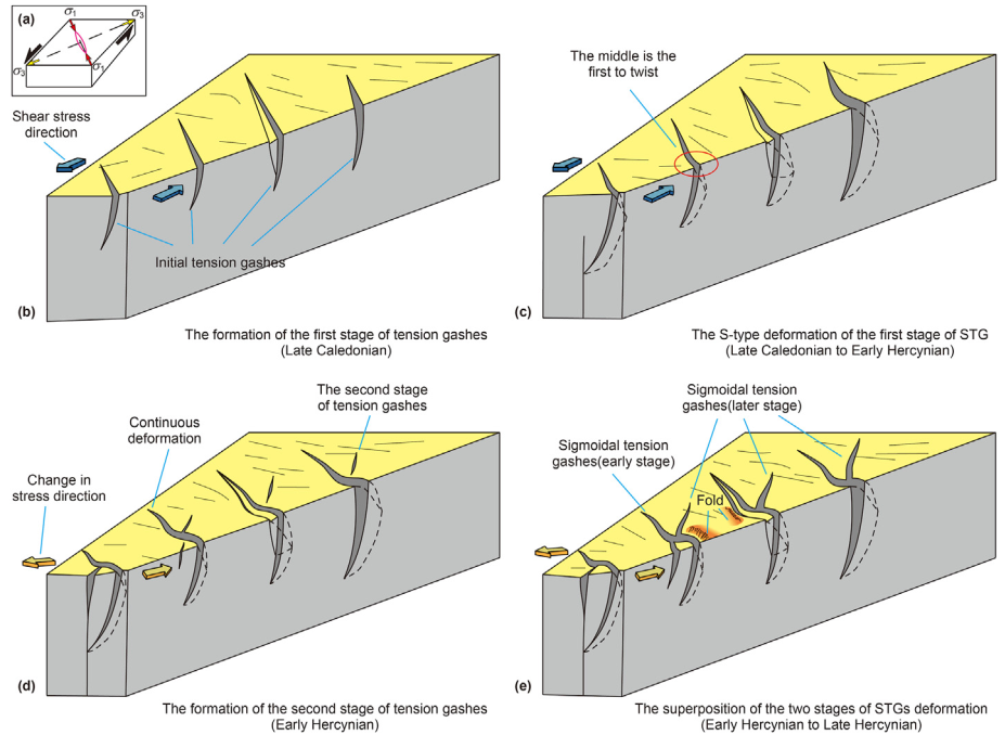 图2. Sigmoidal tension gashes形成机制模式图