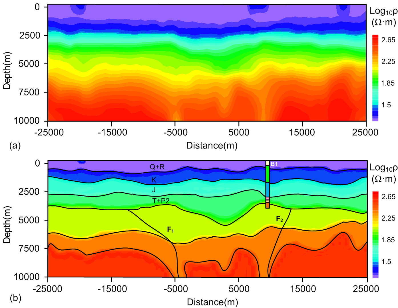 图2. 实测数据的反演结果。(a)未施加约束的反演结果。(b)施加联合约束的反演结果