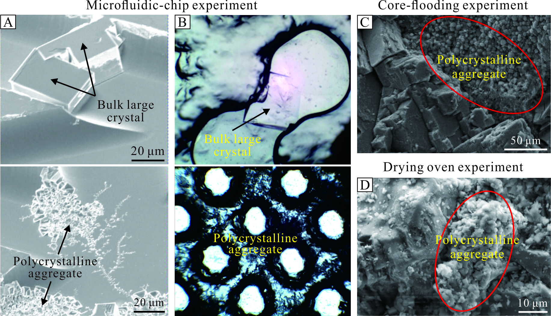 图1. 盐自形单晶体和盐微晶集合体:(A-B)微流控芯片实验(Kim et al., 2013; Miri et al., 2015)、(C)岩心驱替实验(Tang et al., 2023)、烘箱干燥实验