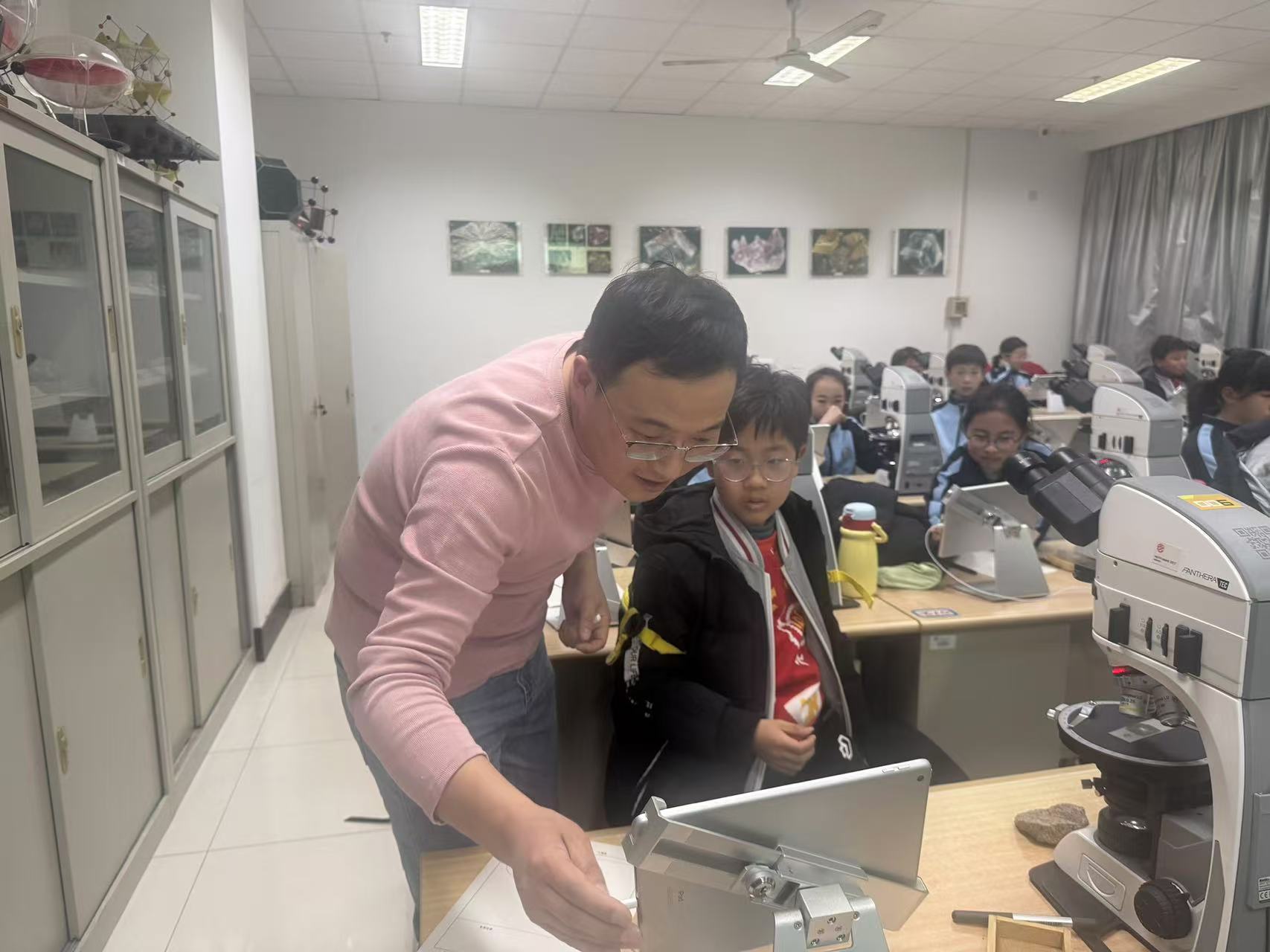 活动当天下午,为了让同学们更直观地领略地球科学的奥秘,学院特别向师生们开放了两个本科教学实验室。在胡万龙老师和颜世永老师的引导下,同学们首先通过理论学习,系统认识了花岗岩的特征与矿物组成、微体古生物的外形和内部结构等基础知识。随后,大家借助显微镜进一步观察标本的微观特征,从宏观感知步入了微观探索的世界。岩石与化石不再是陌生而冰冷的对象,它们仿佛化作了解读地球演化历程的“自然密码”。