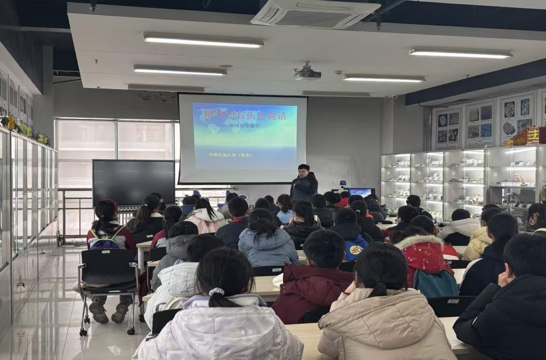 随后,师生们走进地质博物馆,近距离观察了多种珍稀化石标本、矿物与岩石标本和地球演化简史。在紧接着举行的科普报告会上,学院马存飞老师向同学们介绍了关于地球科学的知识,与同学们进行了面对面的交流互动。这一环节不仅拉近了青少年与科技工作者之间的距离,也将求真务实的科学精神与严谨创新的科研品质娓娓道来。